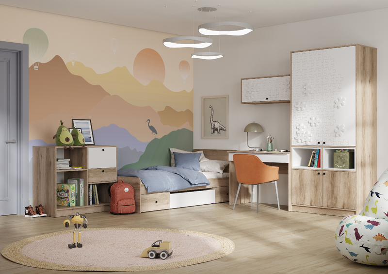 Модульная детская Киви состоит из нескольких модулей, которые обеспечат удобство и функциональность для детской комнаты. Этот комплект поможет создать уютное и функциональное пространство для ребенка, где он сможет играть, учиться и отдыхать с комфортом.