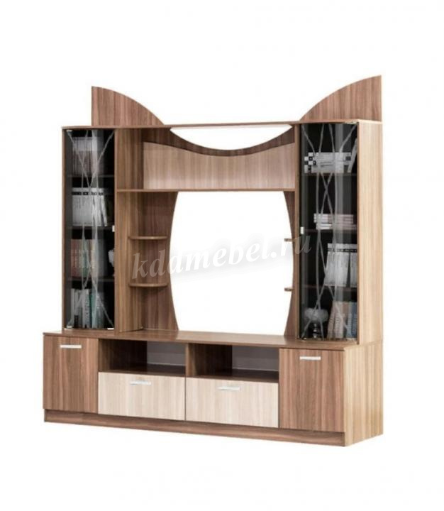 Центральная секция Ольбия является замечательным и достаточно практичным дополнением общего интерьера уютной гостиной. Специальная подставка создана для размещения телевизора для более комфортного просмотра, а открытые ниши - для необходимой аппаратуры. За стеклянными дверцами и на открытых полках будут отлично смотреться наборы посуды, коллекция дорогих напитков, интересные книги, семейные фотографии и различные предметы декора. Выдвижные ящики и отделения с дверцами пригодятся для хранения более ценных и важных вещей. Мебель Ольбия приятно удивит элегантностью, а особый рисунок на фасаде привлекает изящностью, не оставляя никого равнодушным.