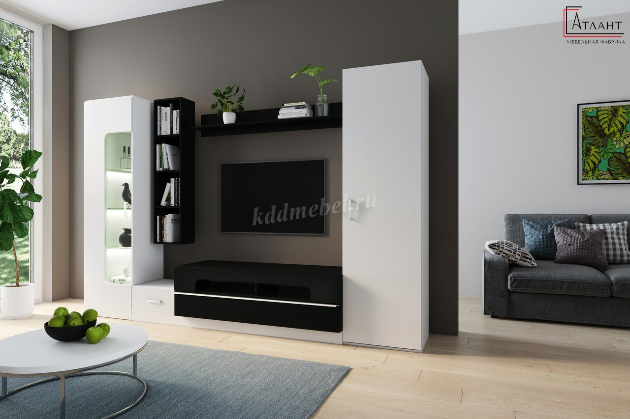 Черно-белое сочетание, впишет гостиную Лофт-20 в любой интерьер. А теплый свет подсветки в полках и нише тумбы создаст дополнительный уют.