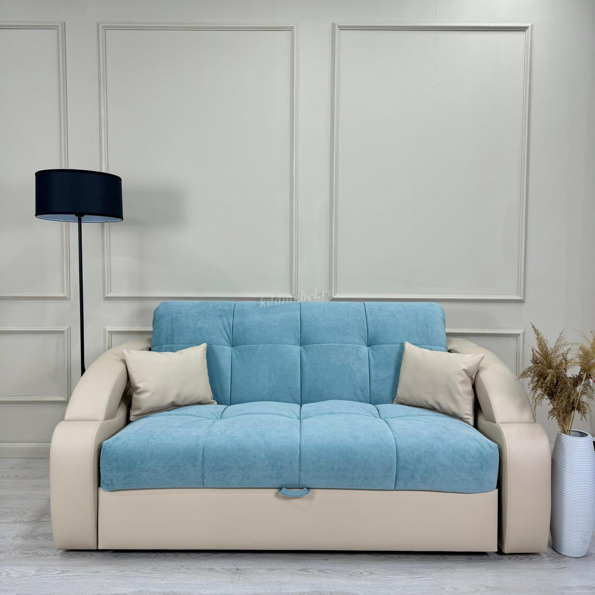 Стильный современный диван. Мягкие дугообразные подлокотники. Ровное спальное место. Возможность использования в качестве центрального объекта интерьера. В основании спального места металлический каркас с поддерживающими деревянными латами и механизмом трансформации «аккордеон». Матрас на эластичном ППУ. Съемный чехол спального места. Спальное место формируется следующим образом: цокольная часть сиденья выдвигается вперед до упора, спинка, состоящая из сложенного листового пенополиуретана, раскладывается. Для трансформирования не требуется расстояние между стеной и диваном. На фото показана модель дивана, расцветку возможно сделать под заказ или выбрать по наличию на складе. Цена может меняться в большую или меньшую сторону, в зависимости от ткани.
