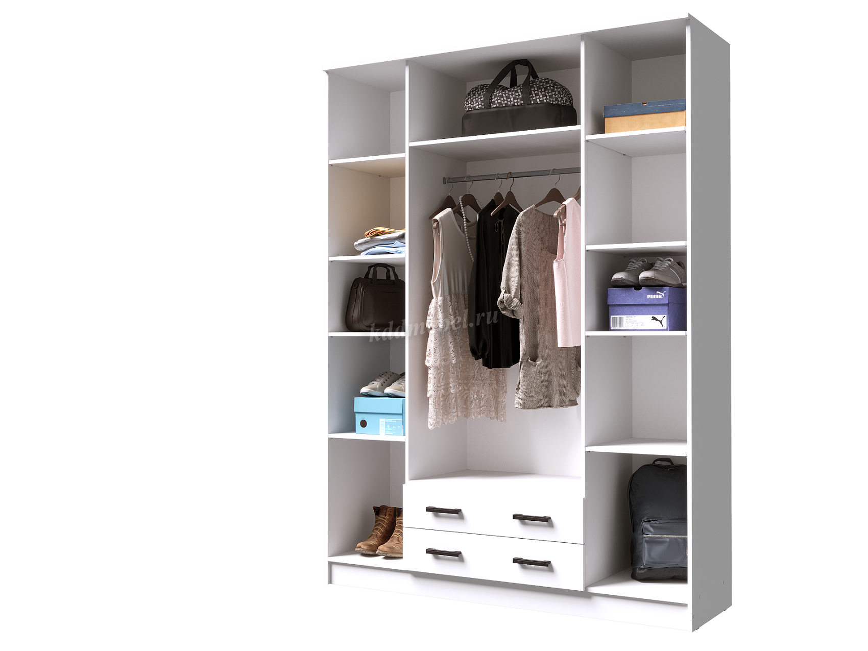 За крайними дверцами (слева и справа) у шкафа Квадро находятся полочки для белья либо других Ваших вещей;
